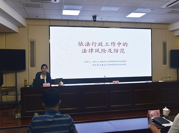 为扎实推进依法行政,提升干部职工法治素养,8月11日,本所第一党支部书记、合伙人赵元元、专职律师韩天博受邀前往安徽省广播电视局开展依法行政专题讲座。局党组成员、副局长董荣主持讲座,局党组成员、二级巡视员、机关全体人员,直属各单位中层以上干部参加讲座。