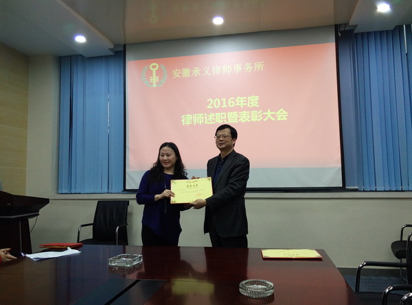 2017年1月15日,安徽承义律师事务所“关于表彰汪益平、石立云等同志荣膺‘优秀共产党员’、‘先进工作者’和‘优秀律师’的决定”,为激励先进、弘扬正气,全力塑造展现承义人的良好形象和时代风貌,全面推进本所各项事业健康、稳定、快速发展,经本所合伙人会议评议,决定对本所律师工作、后勤保障、热爱公益等方面做出突出贡献的个人予以表彰嘉奖。会议决定授予汪益平律师2016年度“优秀党员”光荣称号;苏莉莉同志2016年度“先进工作者”光荣称号;授予石立云、张杰、蔡蕾、连佩庆、席俊义律师2016年度“优秀律师”光荣称号。