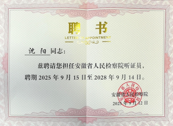 承义荣誉丨本所高级合伙人沈阳受聘担任安徽省人民检察院听证员