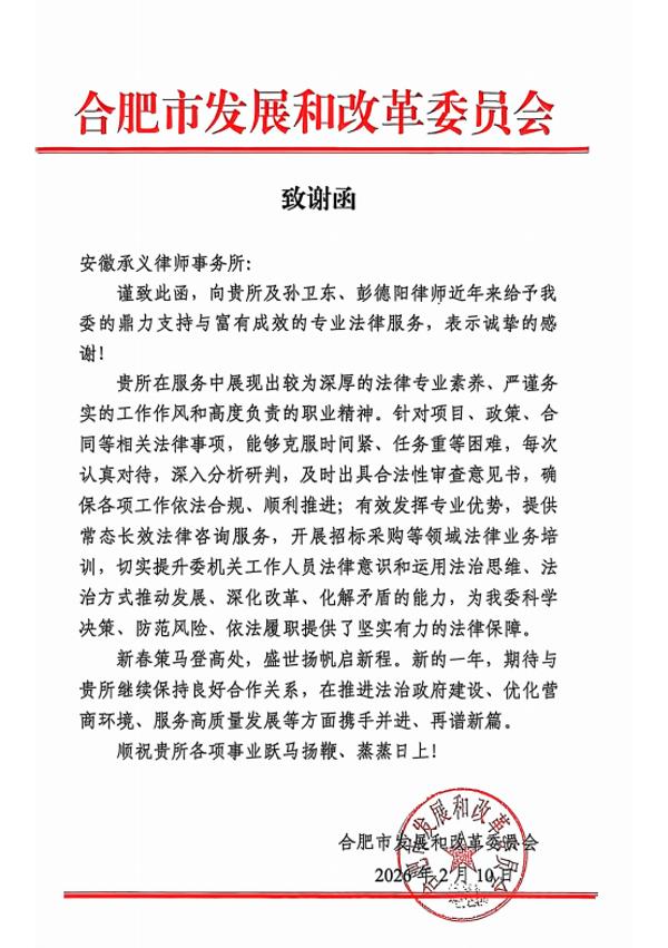 承义荣誉 | 本所获合肥市发展和改革委员会致谢函